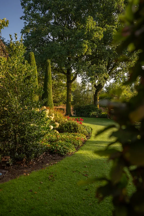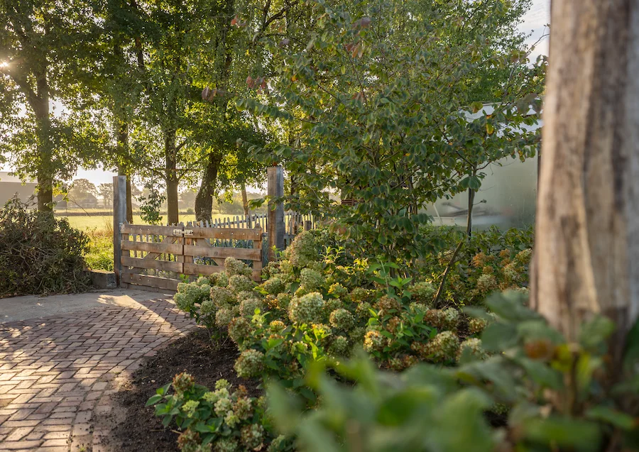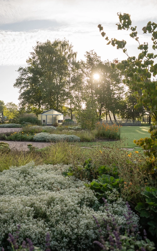 Dicht bij de woning ontstaat een meer intieme setting, terwijl de randen van de tuin vloeiend overlopen in het open landschap.
