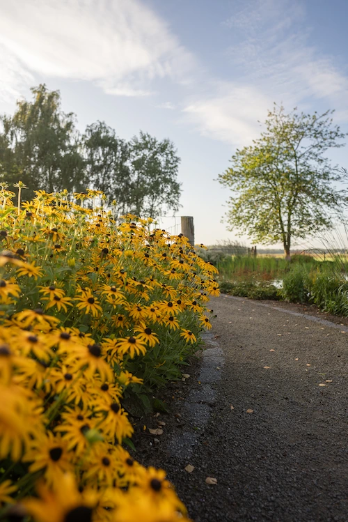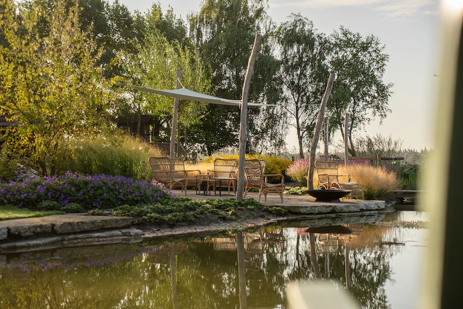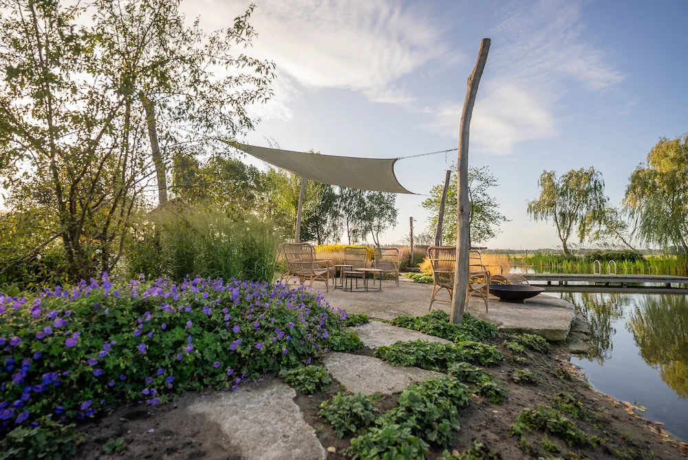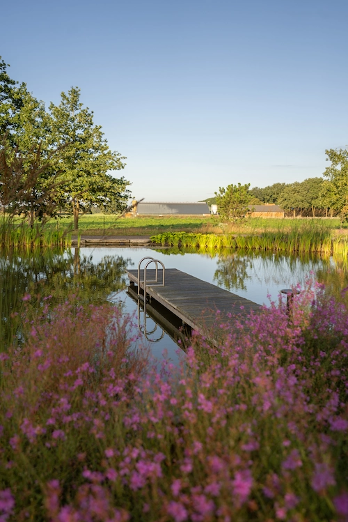 Zo vormt deze tuin een harmonieuze buitenruimte waarin de zwemvijver het natuurlijke middelpunt is en het landelijke gevoel overal aanwezig blijft.