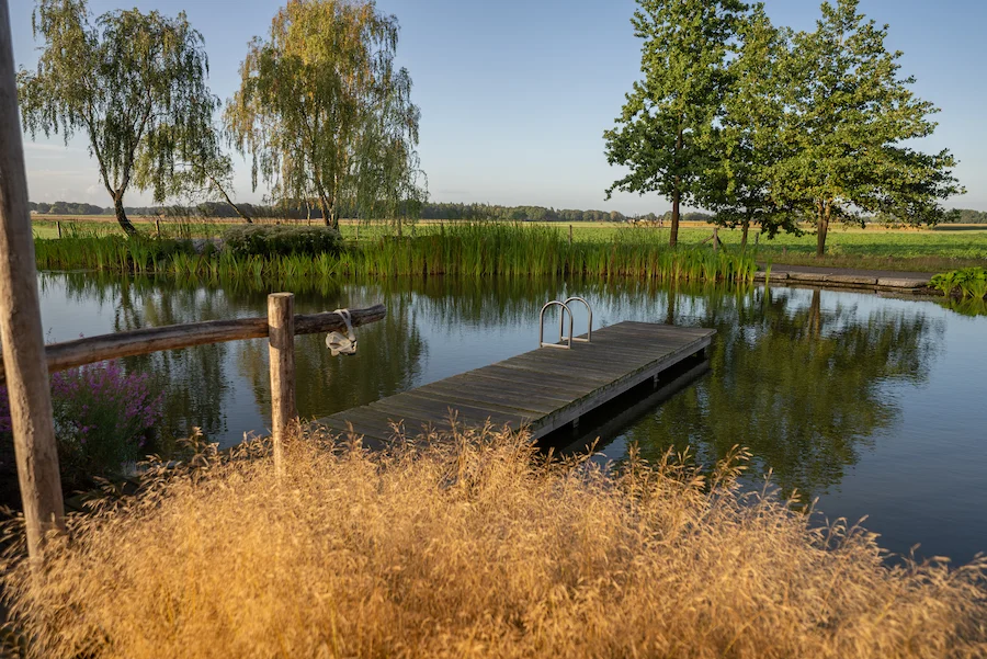 Voor deze tuin creëerden wij een ontwerp waarin de landelijke omgeving en een natuurlijke zwemvijver elkaar versterken.