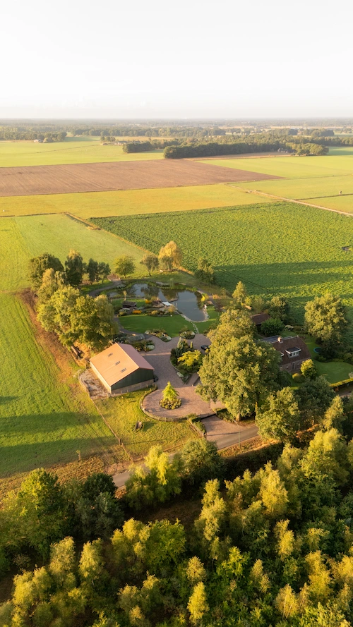 Rondom de woning ligt een uitgestrekt perceel met open vergezichten die de tuin een vanzelfsprekende verbinding geven met de omgeving. De achtertuin wordt bepaald door een royale zwemvijver met natuurlijke oevers en terrassen van hout en natuursteen.