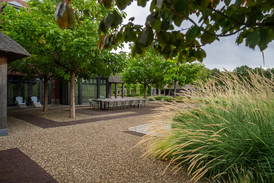 Rondom de woning zijn meerdere terrassen aangelegd. Aan de achterzijde bevindt zich een grote eettafel, beschut tussen gekandelaberde catalpa’s. Hier ontstaat een duidelijke plek om samen te komen, zonder dat het grootschalige karakter van de tuin verloren gaat.