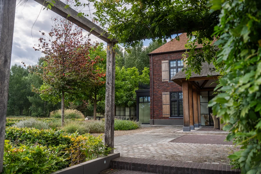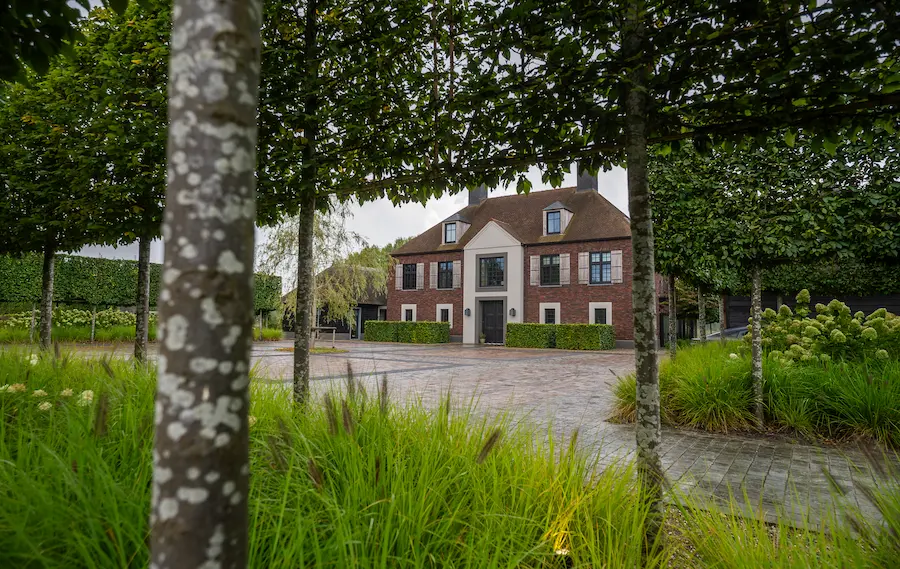 De aankomst begint bij de oprijlaan met lindebomen, die zorgt voor een krachtig en herkenbaar entreegebaar. Aan de voorzijde zijn parkeervakken opgenomen, zorgvuldig ingepast in het groen.