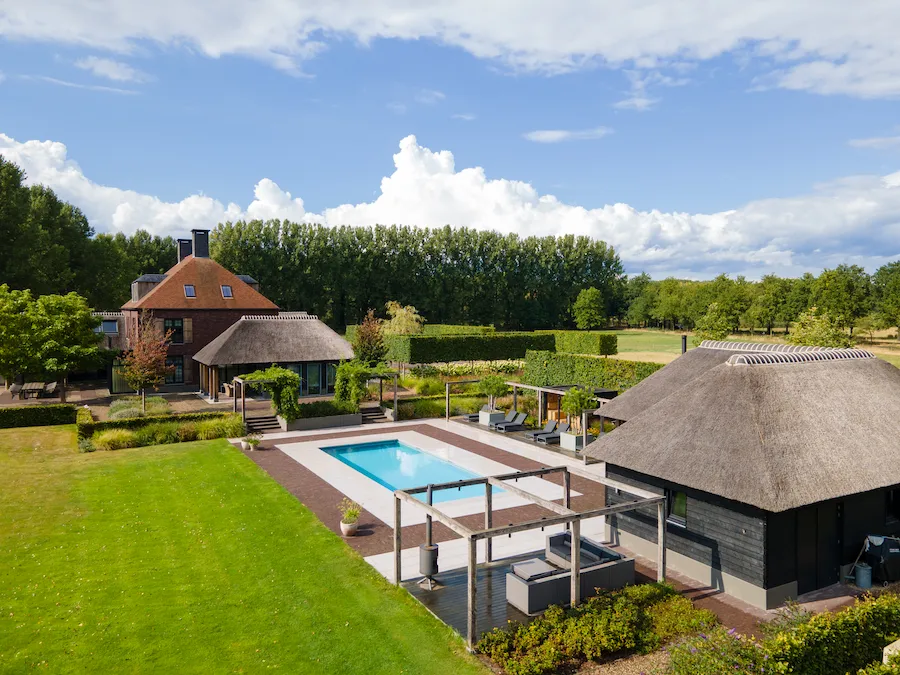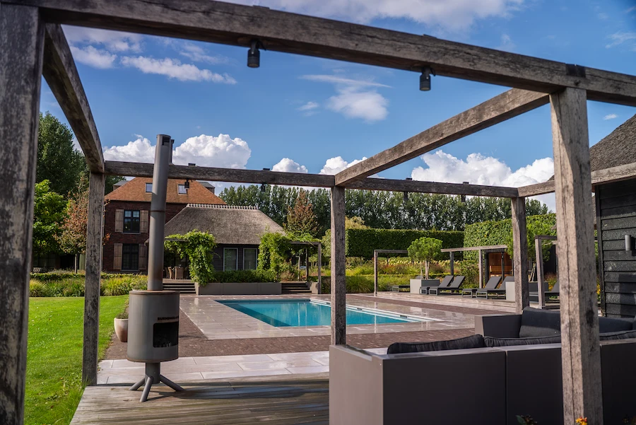 Op afstand van de woning is een apart gedeelte ingericht met zwembad, sauna en tuinhuis.