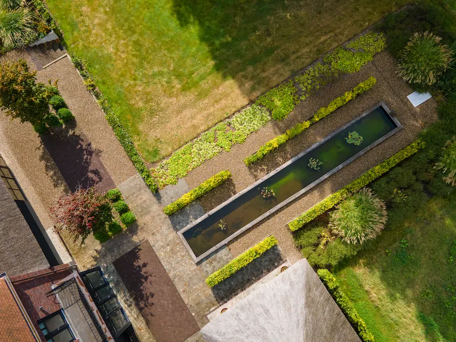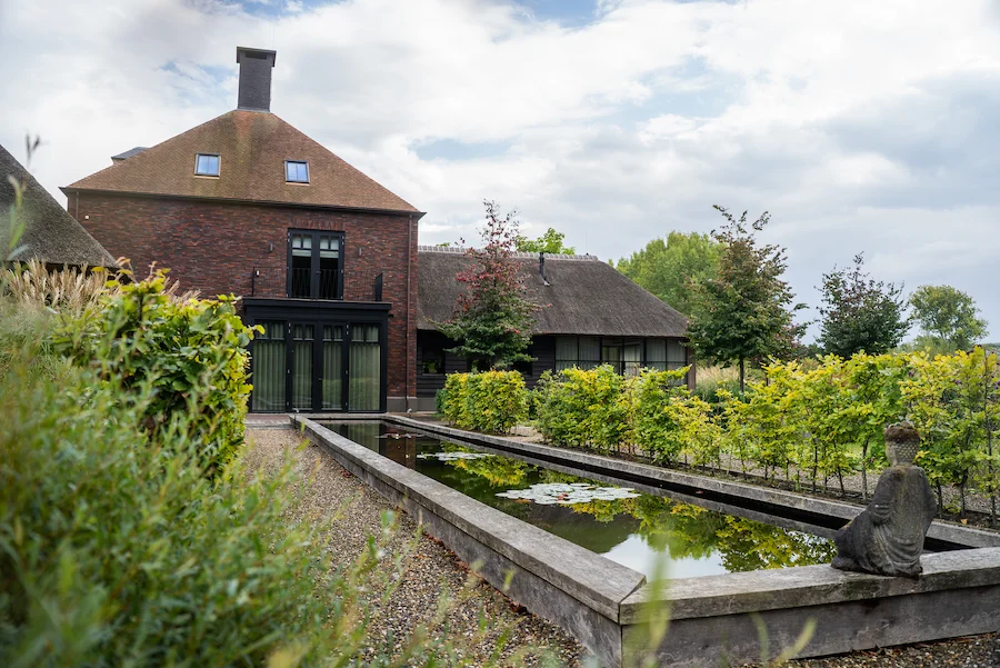 Dicht bij de woning ligt een spiegelvijver met natuurlijke filtering. Deze strakke waterpartij brengt rust en reflectie. Verderop in de tuin ligt een natuurvijver met eiland, losser in vorm en meer onderdeel van het landschap.