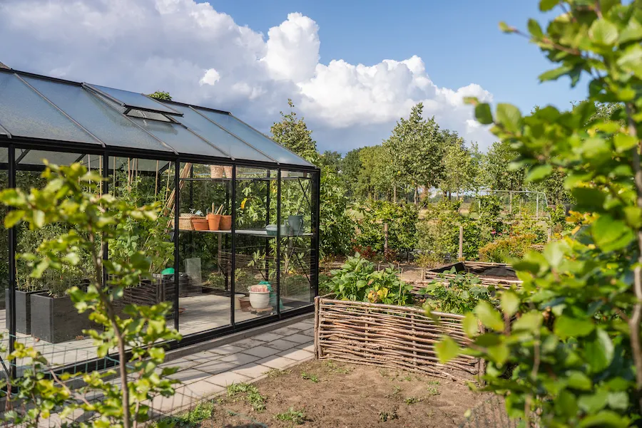 Ook de meer functionele onderdelen zijn geïntegreerd in het ontwerp. De kas met groentetuin voegt functionaliteit toe, zonder de rust van het geheel te verstoren.