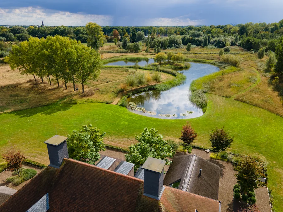 Voor dit landgoed in Nuenen ontwierpen we een parkachtige tuin met een statige oprijlaan, meerdere vijvers en een apart wellnessgedeelte. Grote gebaren en verfijnde plekken wisselen elkaar af.